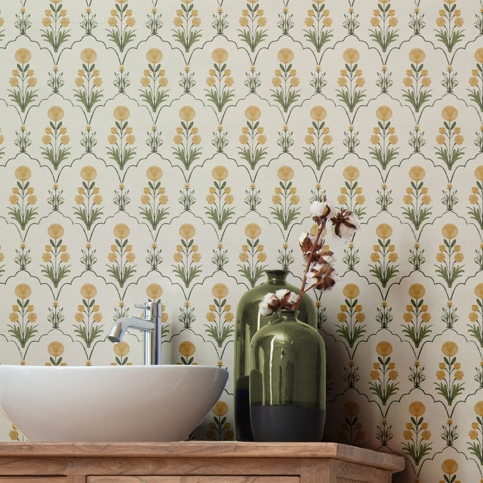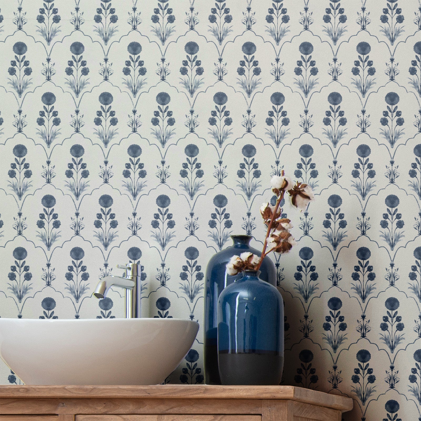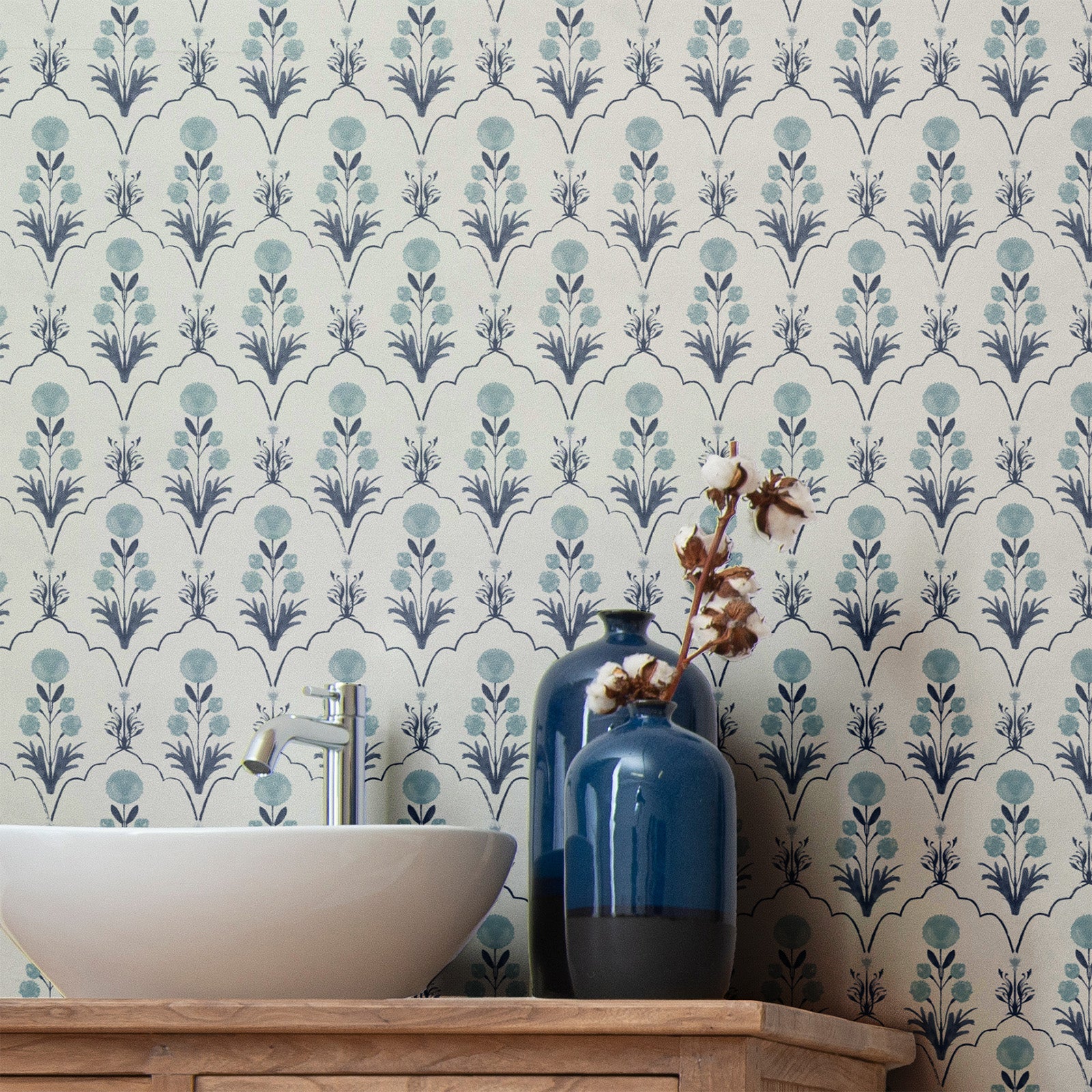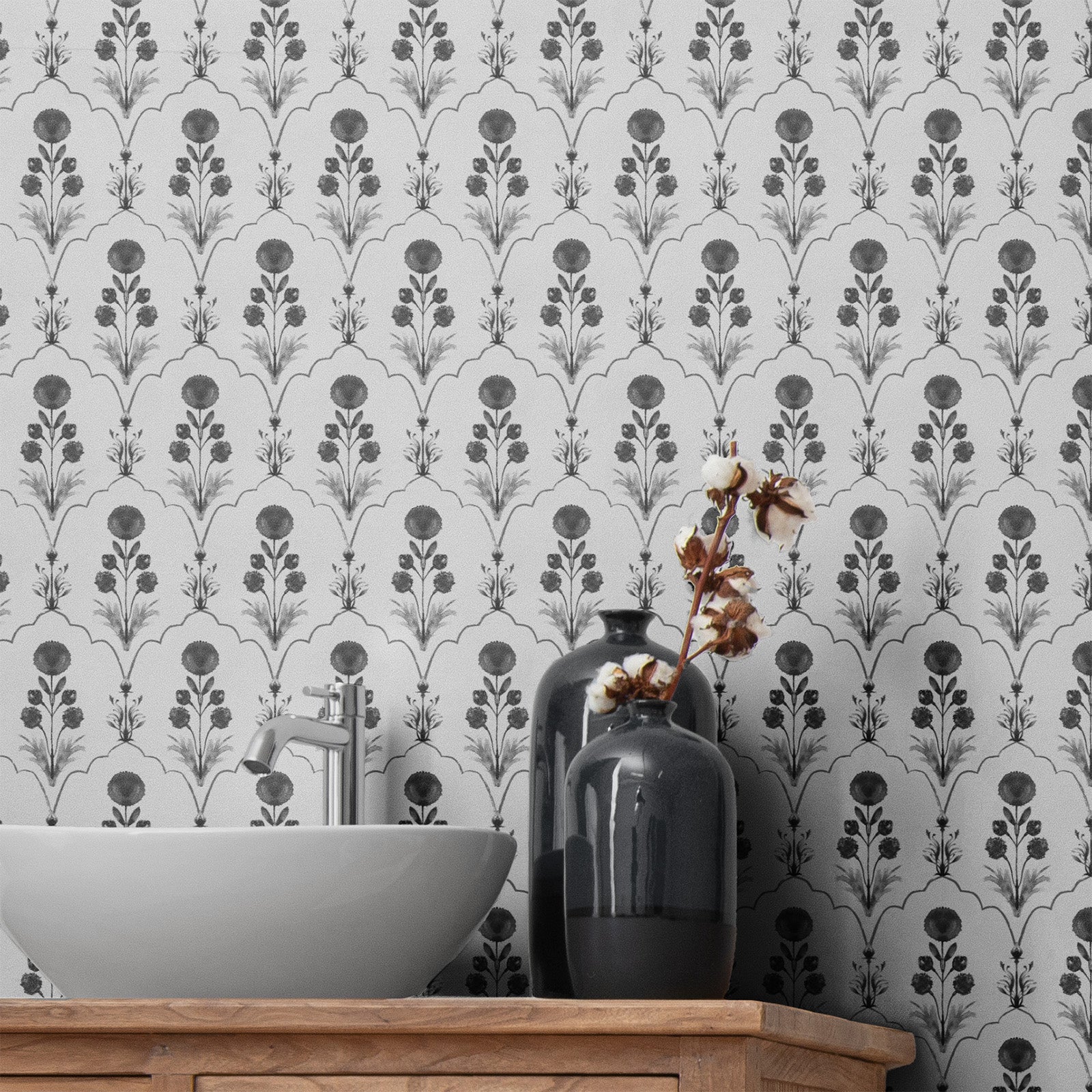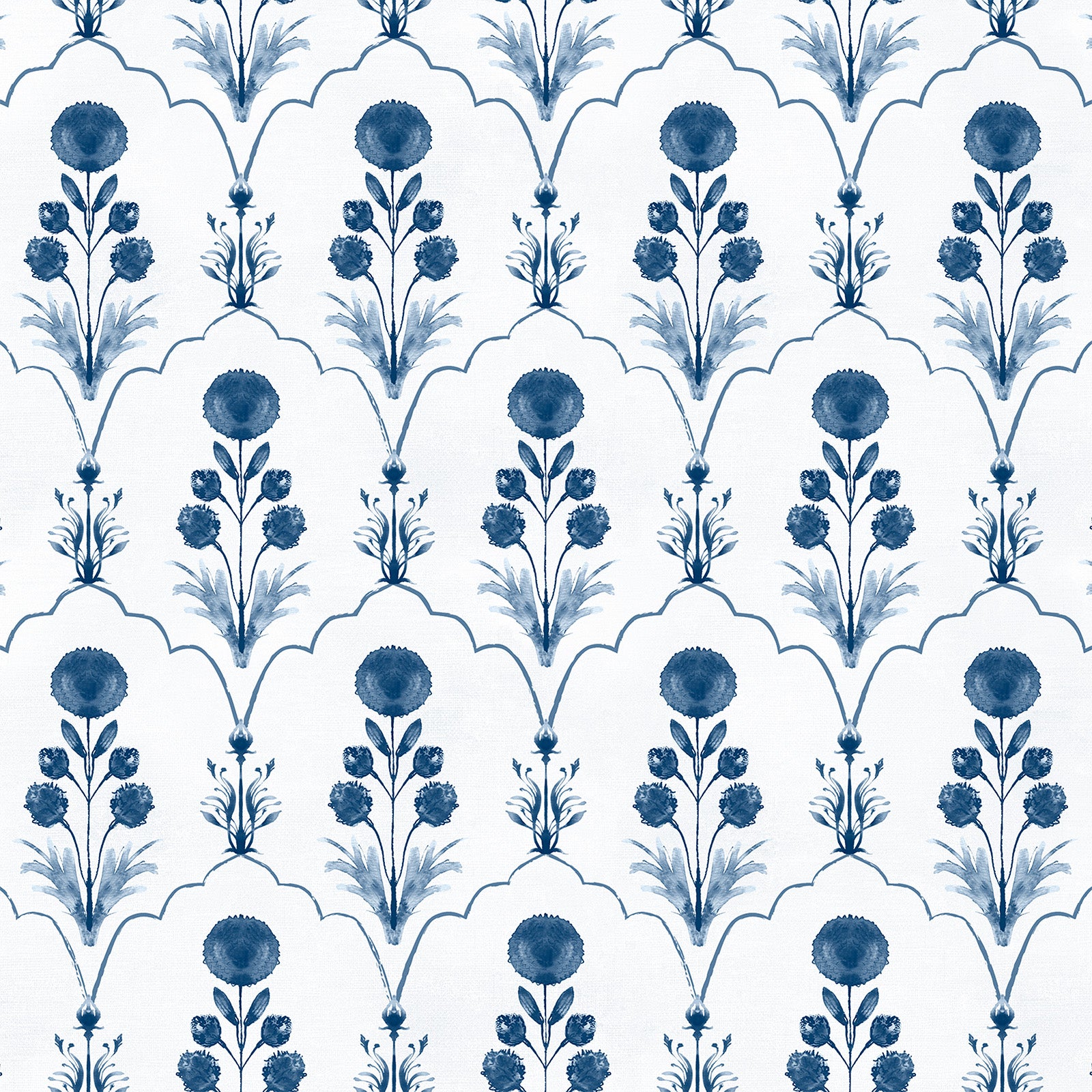 Firdausi reimagines the geometry of Persian arches — each framing a delicately painted bloom inspired by Mughal manuscripts. The interplay of structure and softness creates a sense of harmony and refinement, bridging architectural precision with painterly romance.