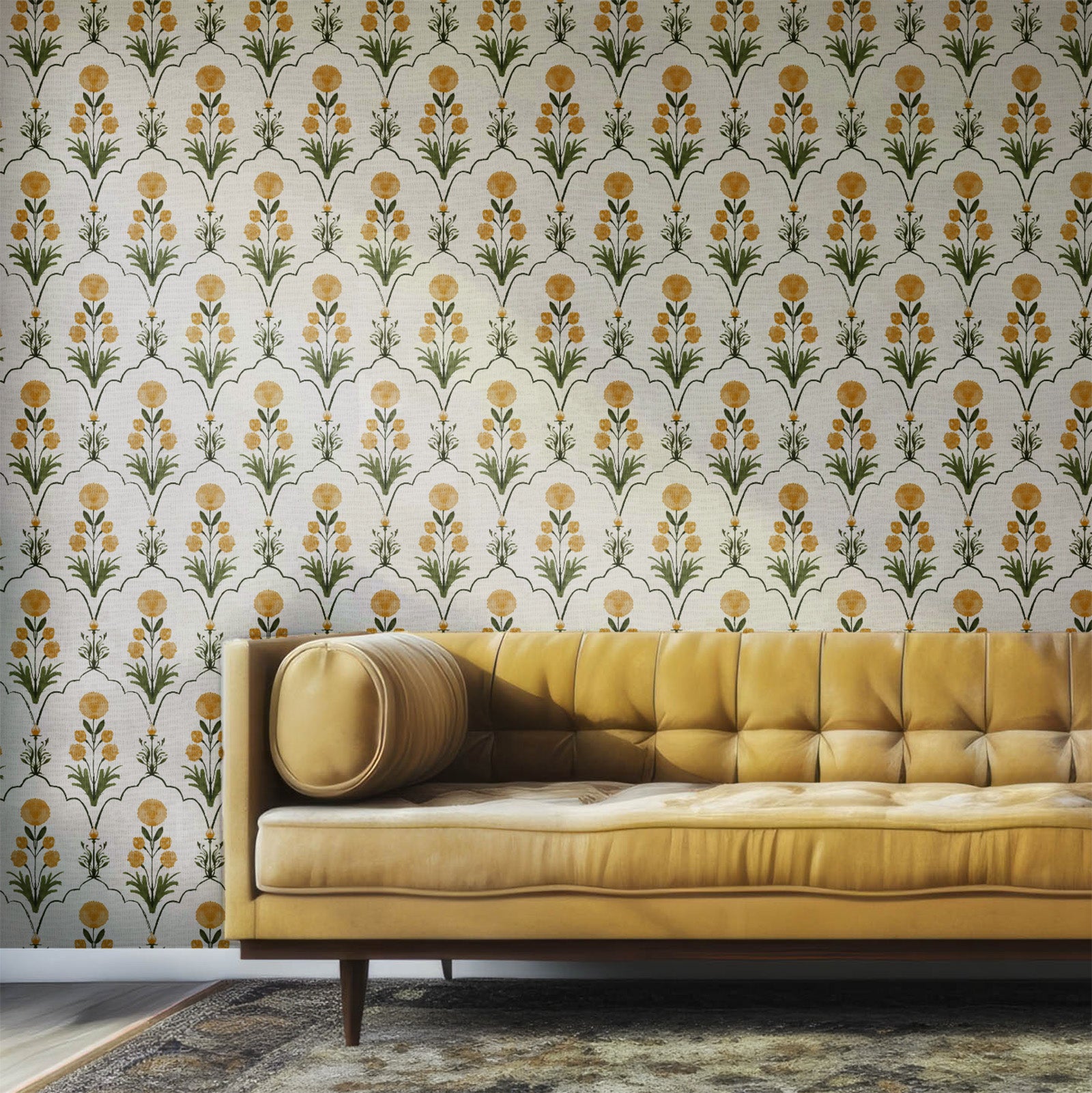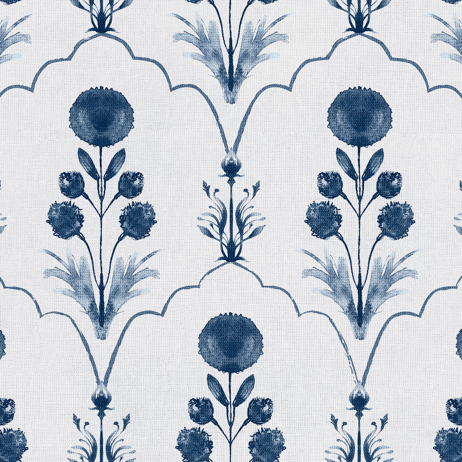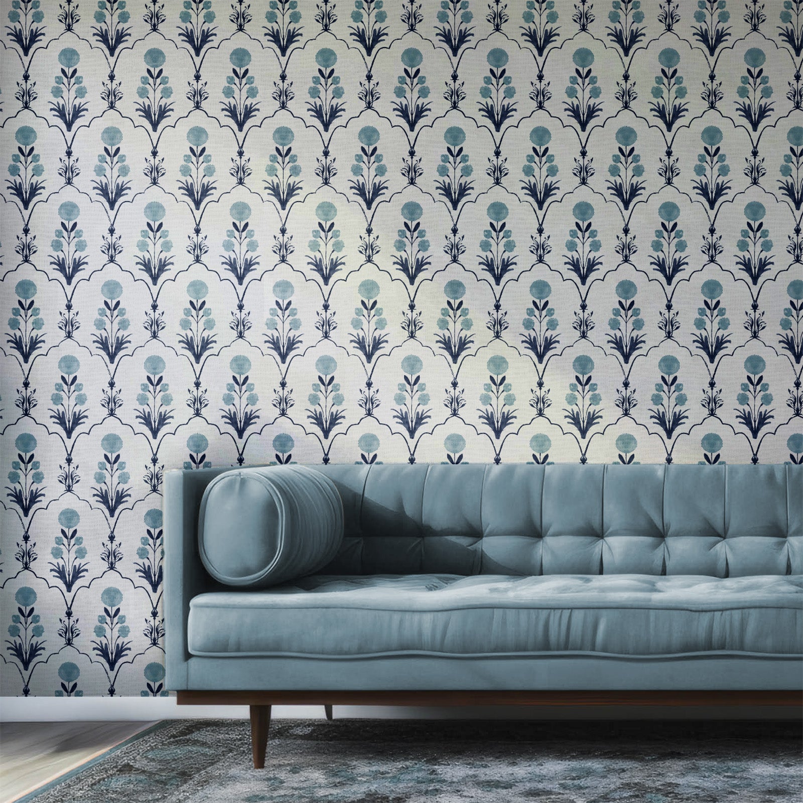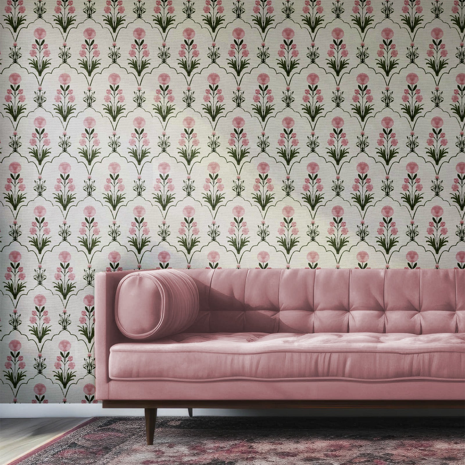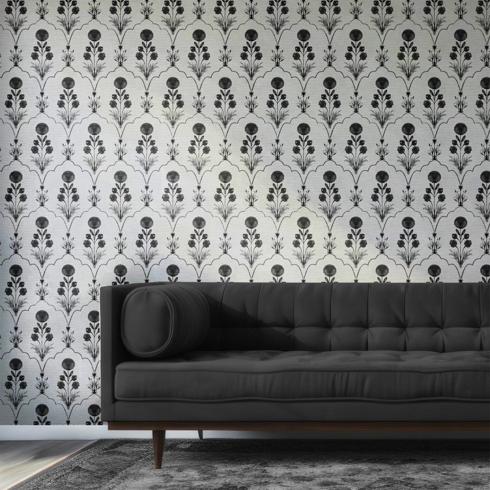 Rendered on natural sisal, Firdausi gains a quiet luminosity. The arches and framed florals are softened by the woven texture, giving the design a sense of depth and subtle grandeur — ideal for interiors that balance tradition with modern sophistication.