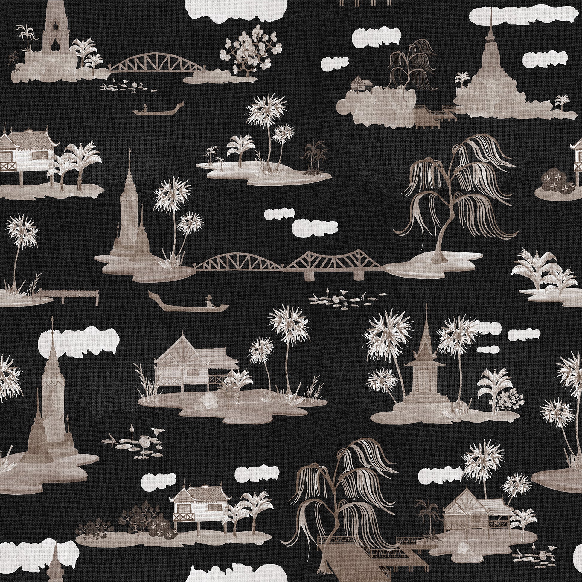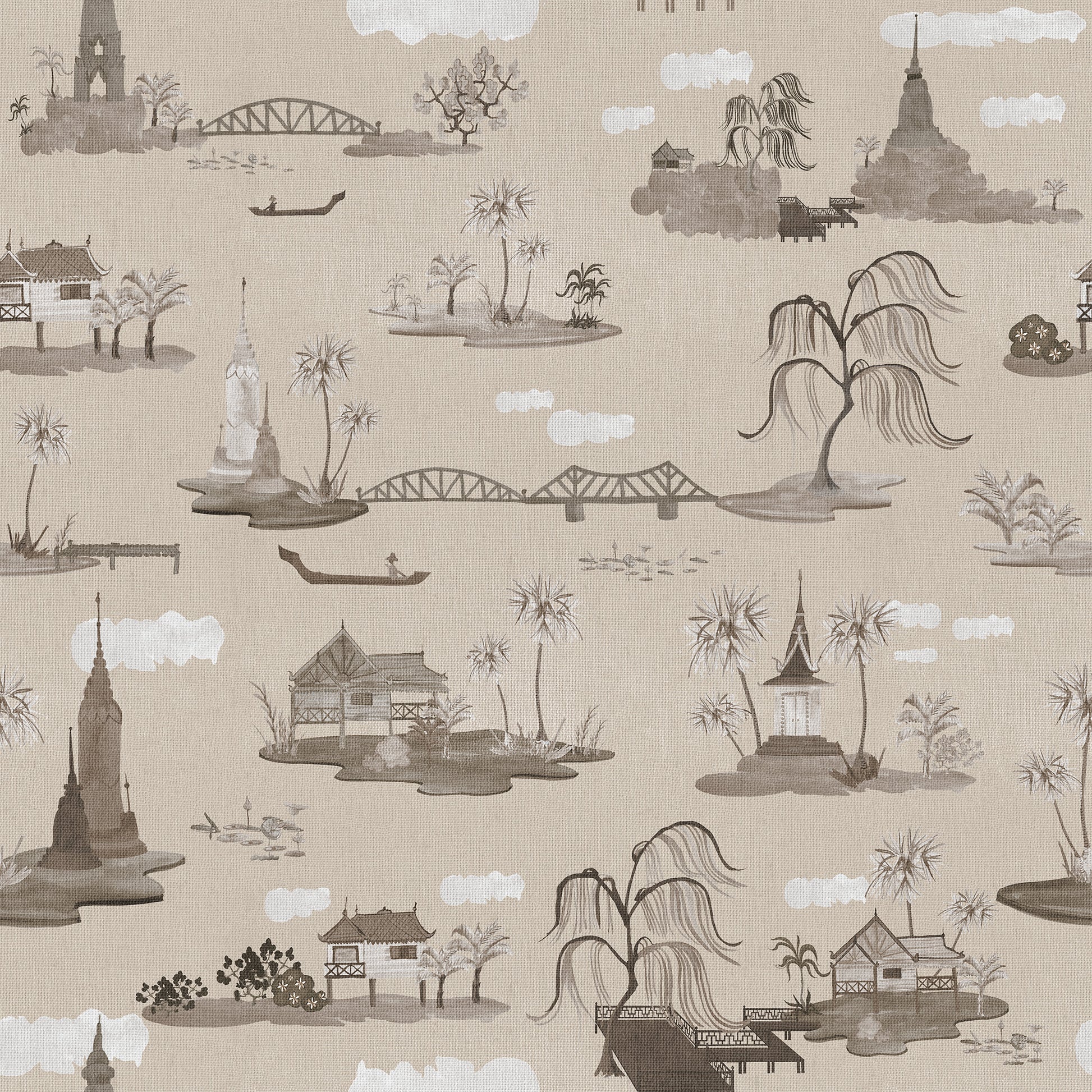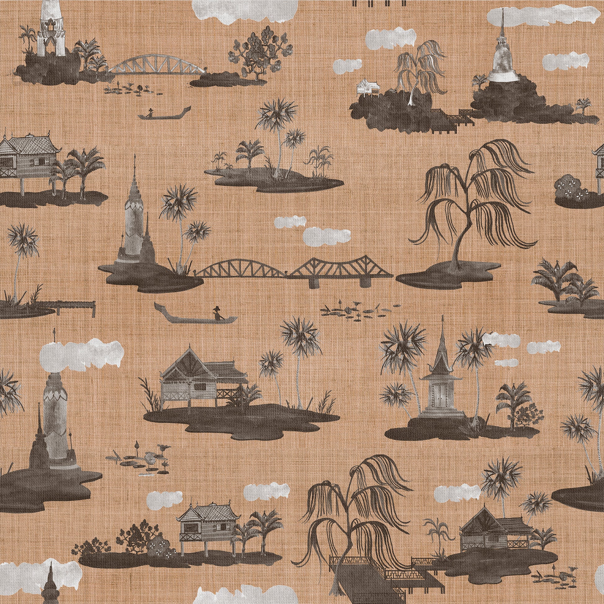 This hand-painted chinoiserie-inspired design finds new depth and dimension when printed on natural grasscloth. Inspired by the artist’s time living in Cambodia, Kingdom of Wonder features scenic vignettes—temples, riverboats, stilted homes, and swaying palms—rendered in delicate, atmospheric detail. The organic texture of grasscloth brings a warm, tactile richness to the design, enhancing its sense of storytelling and quiet luxury.