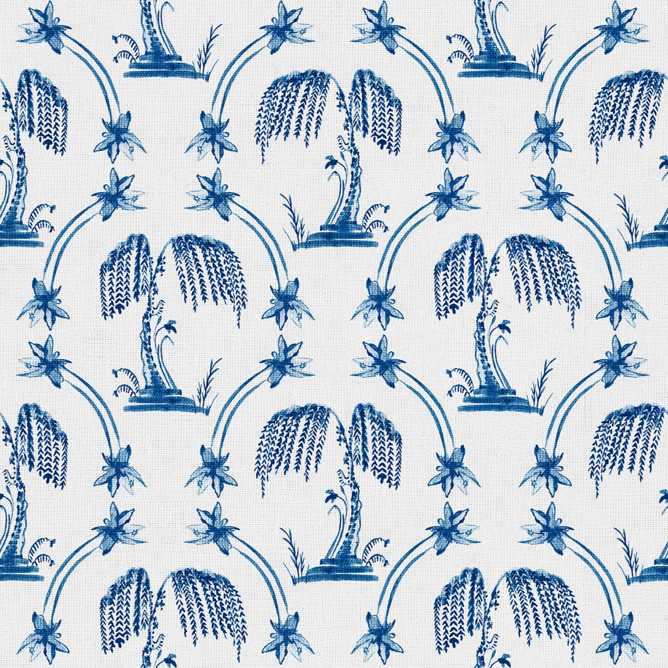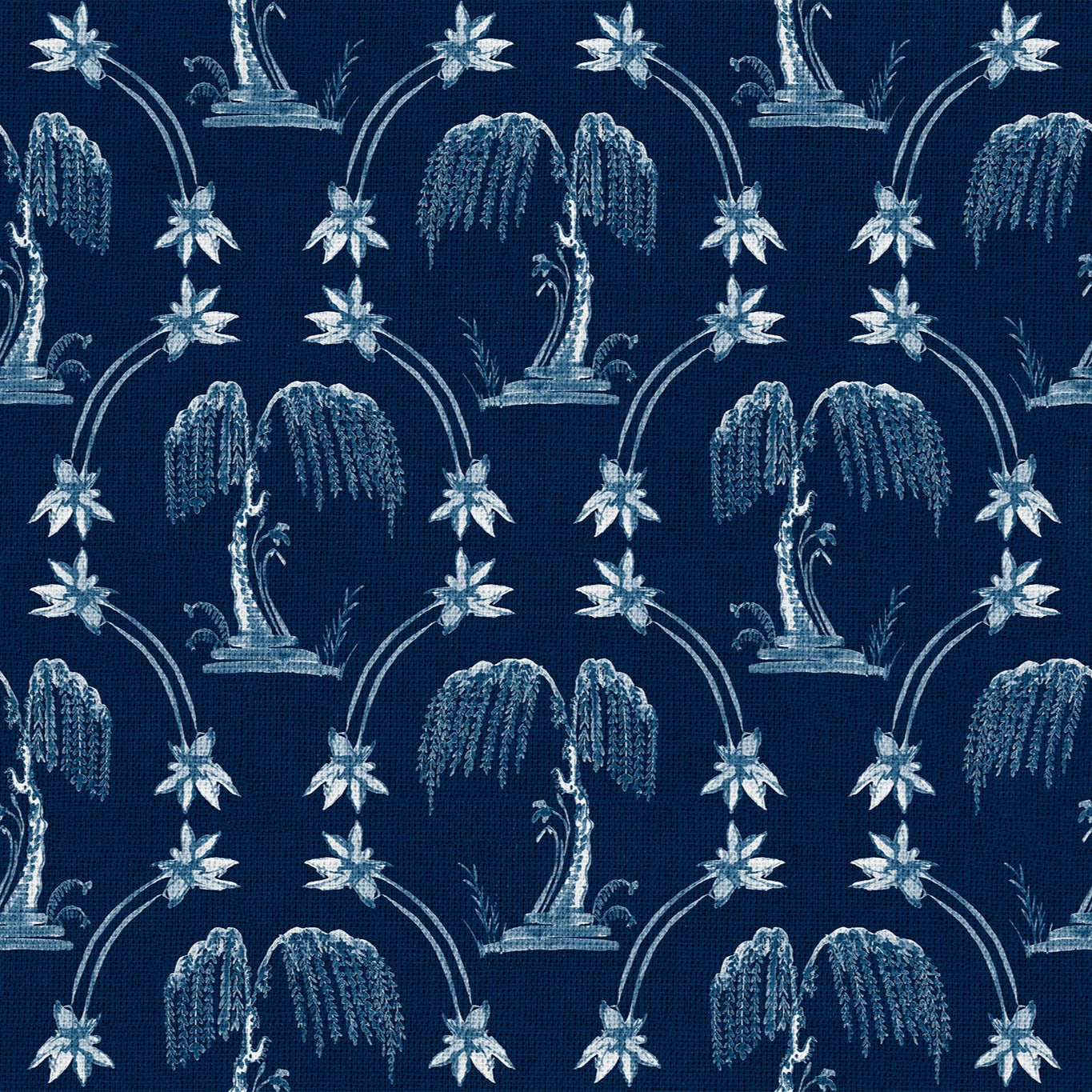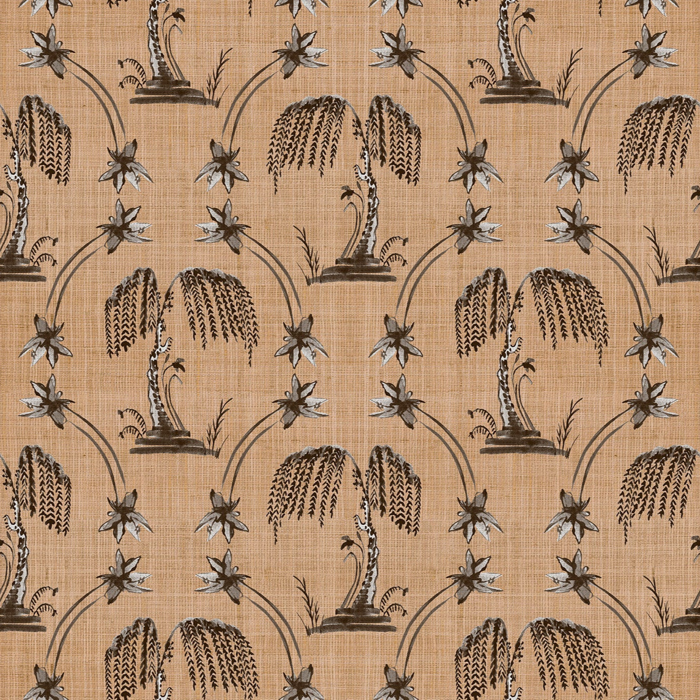 Petal Pavilion brings its lively botanical rhythm to life on natural grasscloth. Arched ogee curves meet at hand painted lotus flowers and are filled with dancing willows which create a pattern that feels both structured and organic. The subtle texture of grasscloth adds richness, depth, and a warm, tactile elegance—perfect for tropical-inspired interiors that lean luxe.