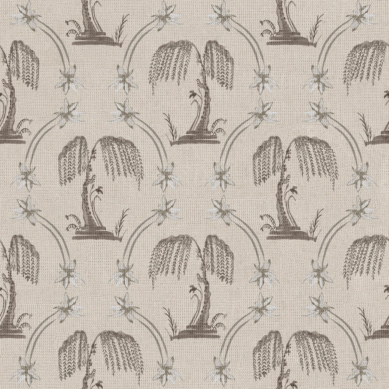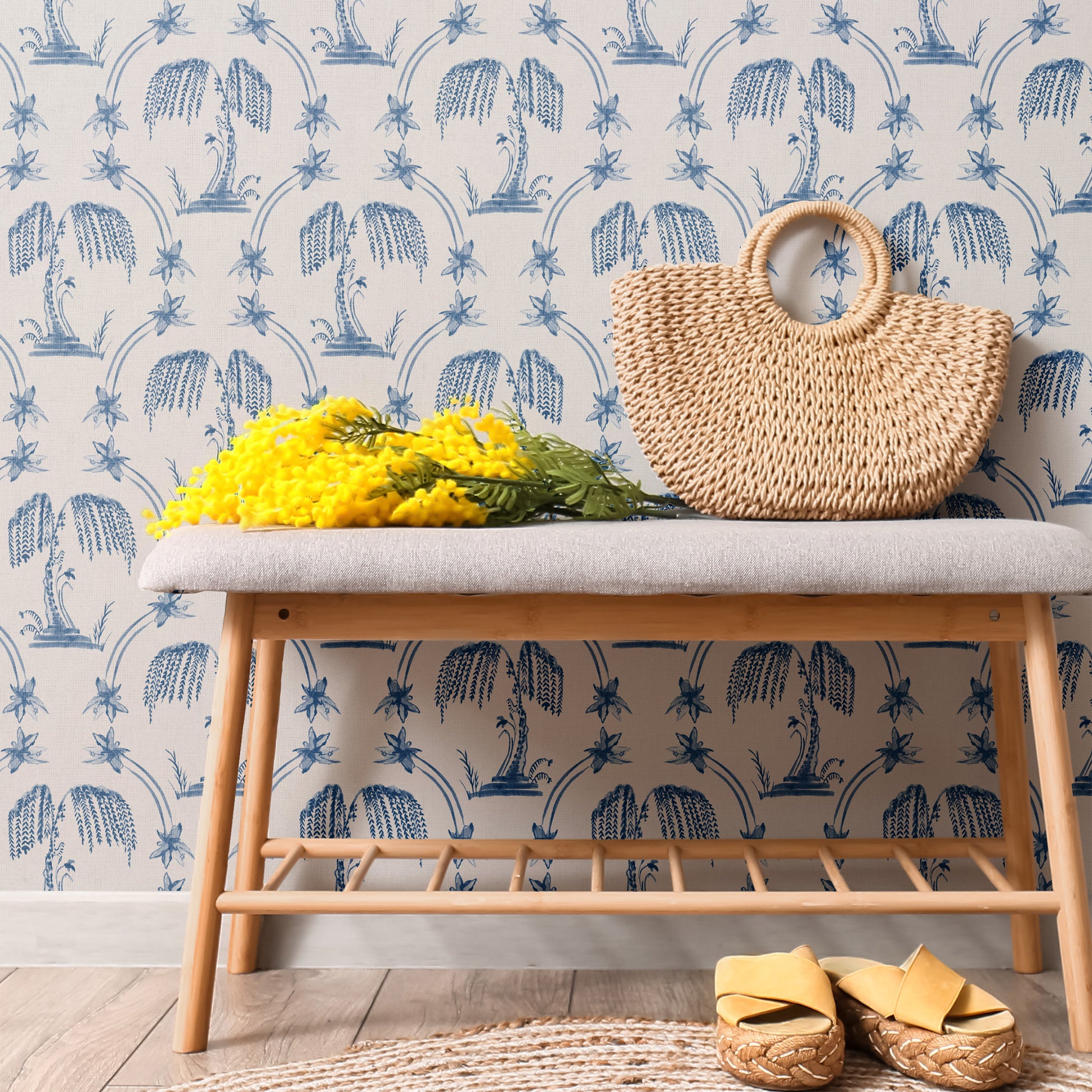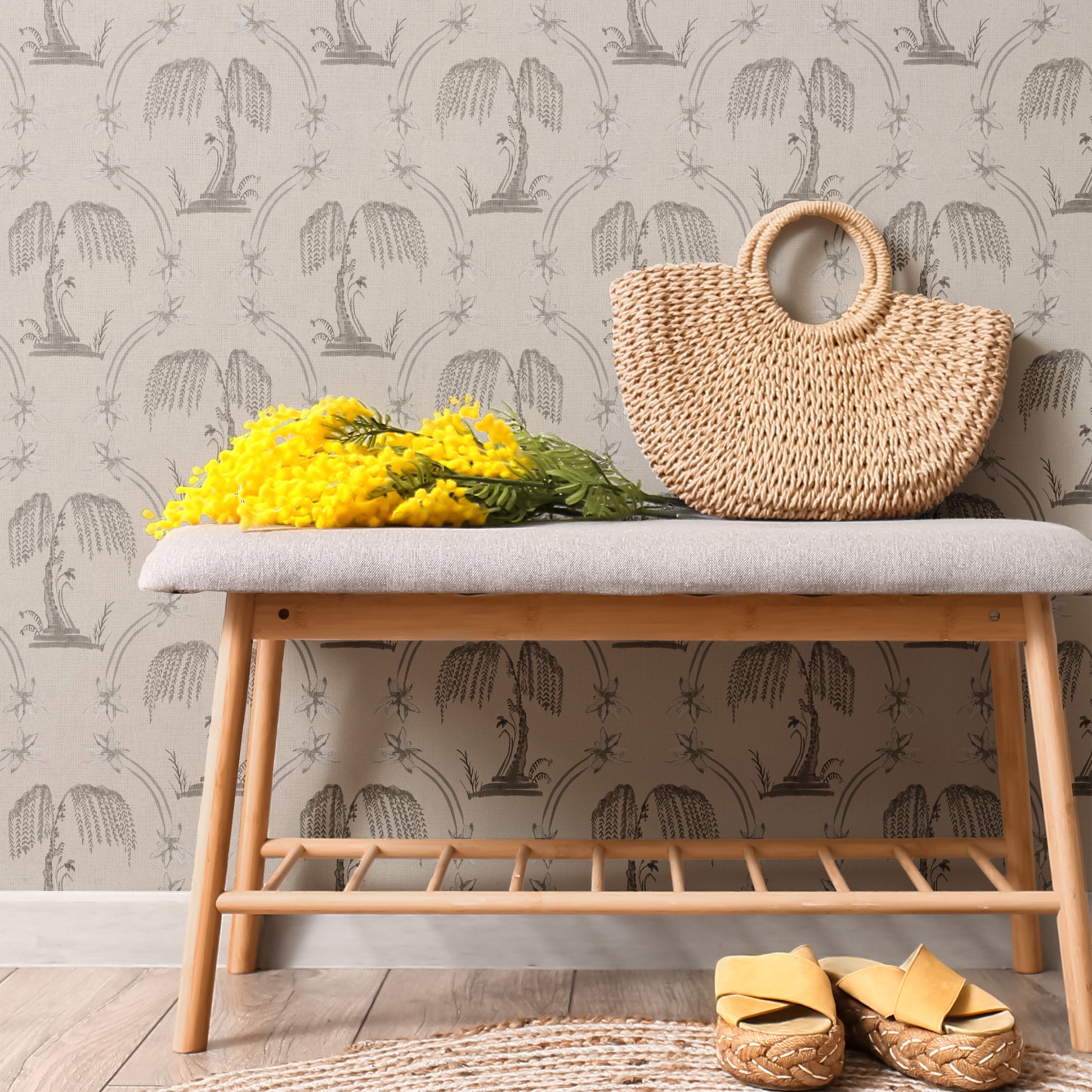 Petal Pavilion brings its lively botanical rhythm to life on natural grasscloth. Arched ogee curves meet at hand painted lotus flowers and are filled with dancing willows which create a pattern that feels both structured and organic. The subtle texture of grasscloth adds richness, depth, and a warm, tactile elegance—perfect for tropical-inspired interiors that lean luxe.